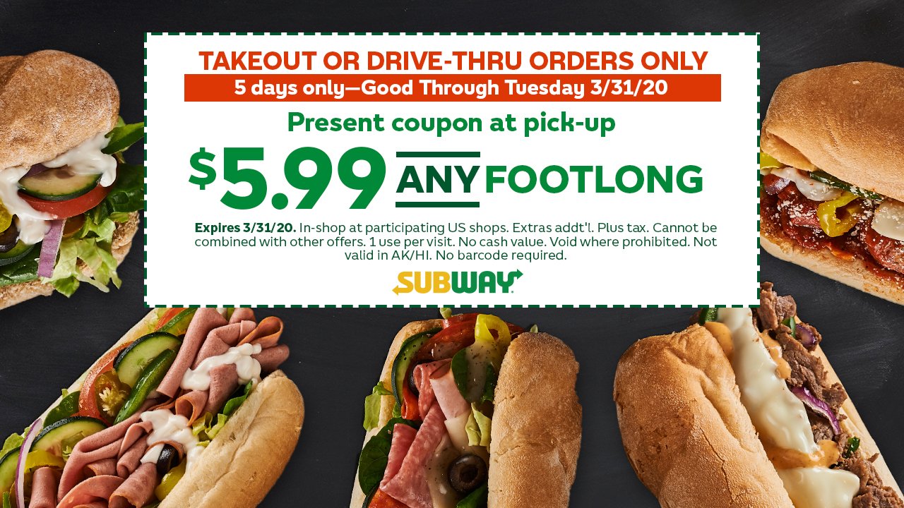 Subway On Twitter This 5 99 Footlong Is Just One Of The Ways We Re Looking Out For You Right Now Take A Screenshot Of The Coupon And Show It At Pickup Take Out